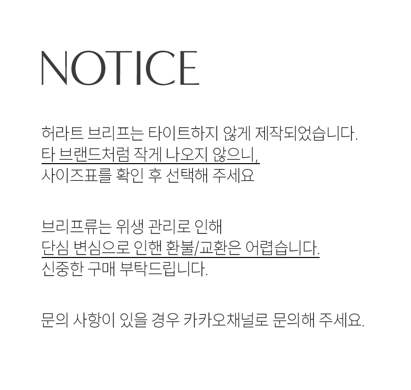 - 허라트 브리프 사이즈는 작게 나오지 않으므로 타사 사이즈로 선택하지 마시고 정사이즈로 선택하는 것을 권해드립니다.